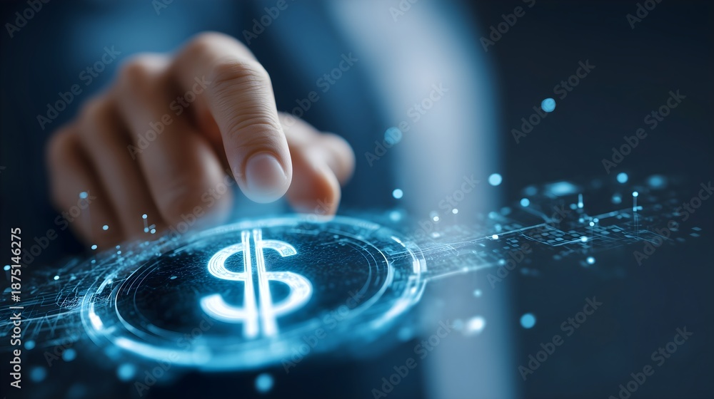Digital finance concept: hand pressing glowing dollar sign button on futuristic interface #1875146275