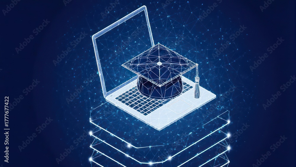 Digital Graduation Cap on Laptop Representing Online Education and E-learning. #1777677422