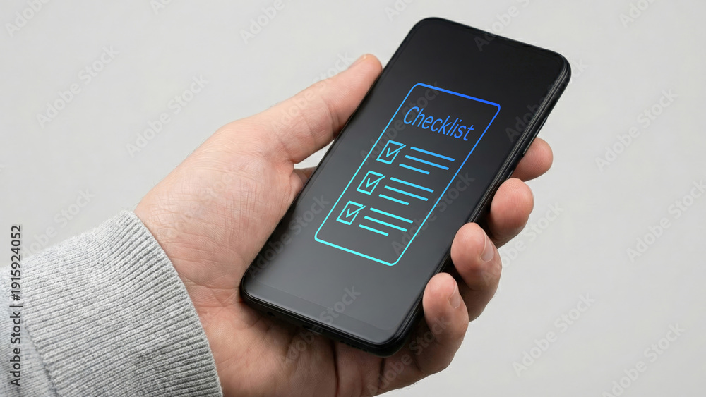 Digital insurance platform checklist on smartphone screen held by hand showing task list and check marks conveying organization and confidence #1915924052