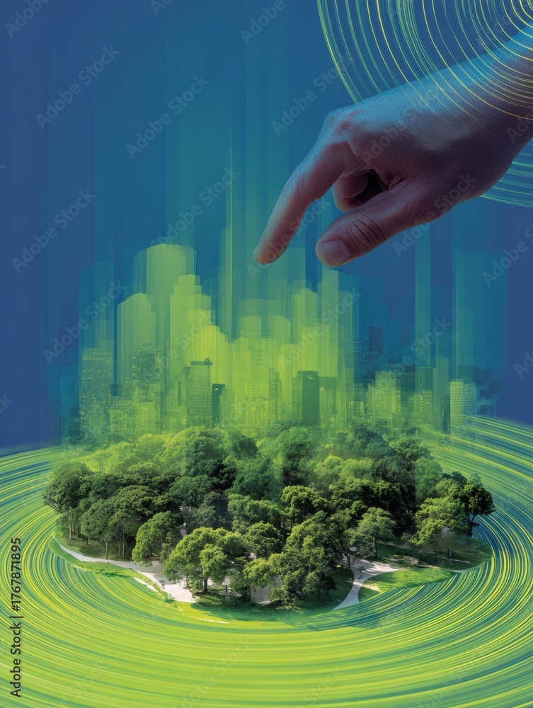 Digital Interaction With Nature and Urban Landscapes Blending in a Futuristic Scene Featuring a Hand Reaching for a Lush Green Island #1767871895