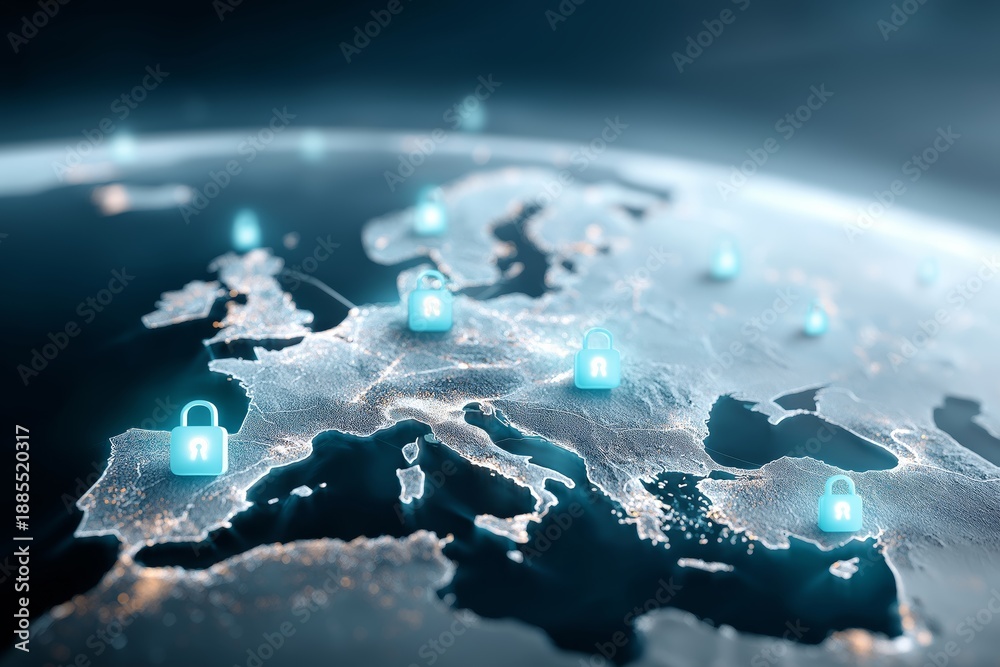 Digital map of Europe with glowing security locks symbolizing cybersecurity data protection digital sovereignty and the growing importance of privacy across European networks #1885520317