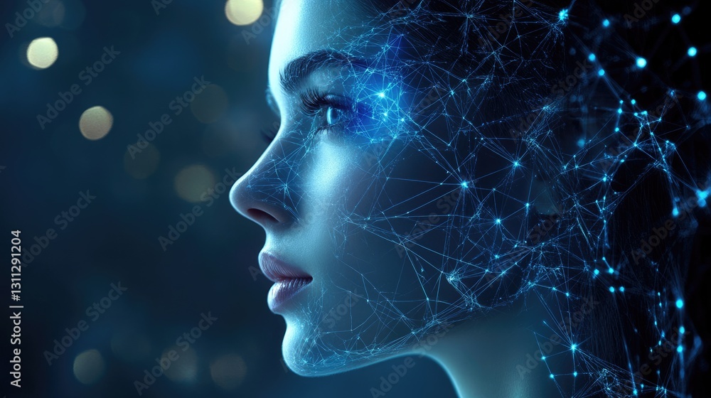 Digital Mindscape: A woman's profile is artfully interwoven with a network of interconnected nodes, symbolizing the boundless potential of artificial intelligence and the human mind #1311291204