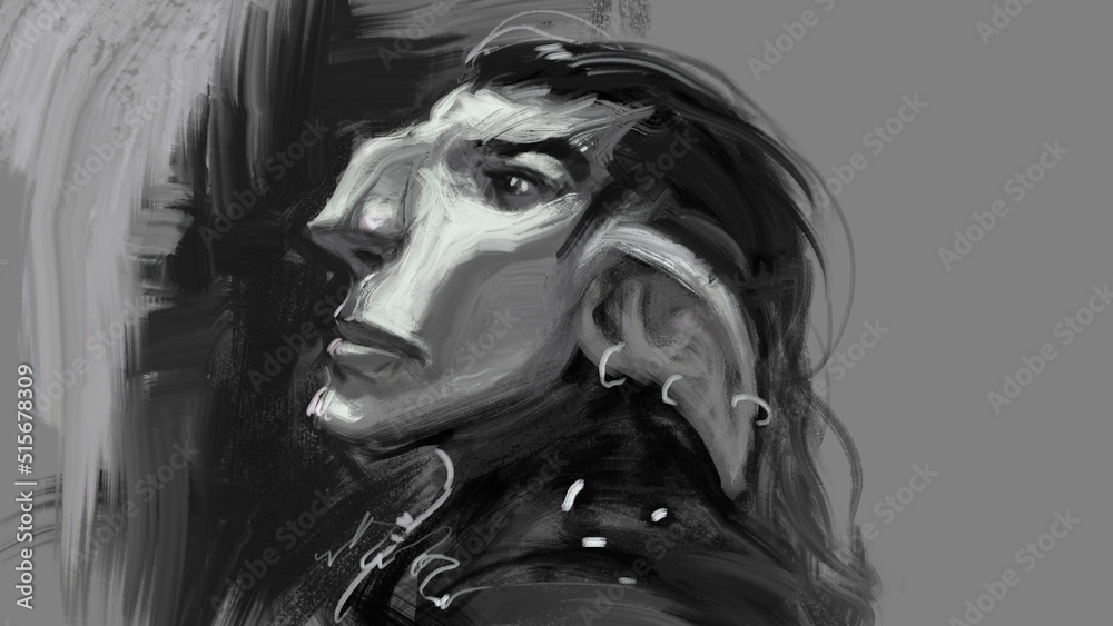 Digital painting of a goblin creature portrait in black and white monochrome - fantasy illustration #515678309