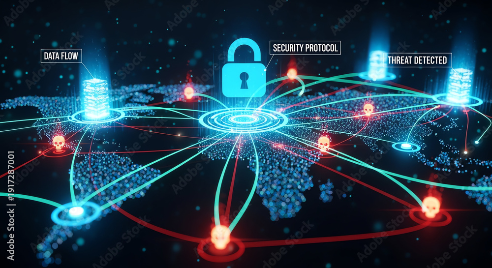 Digital Security and Data Protection Network with Lock and Cybersecurity Icons. #1917287001