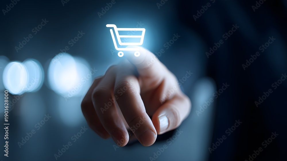 Digital Shopping Experience - Hand Interacting with Illuminated Cart Icon, E-commerce Concept. #1901628000