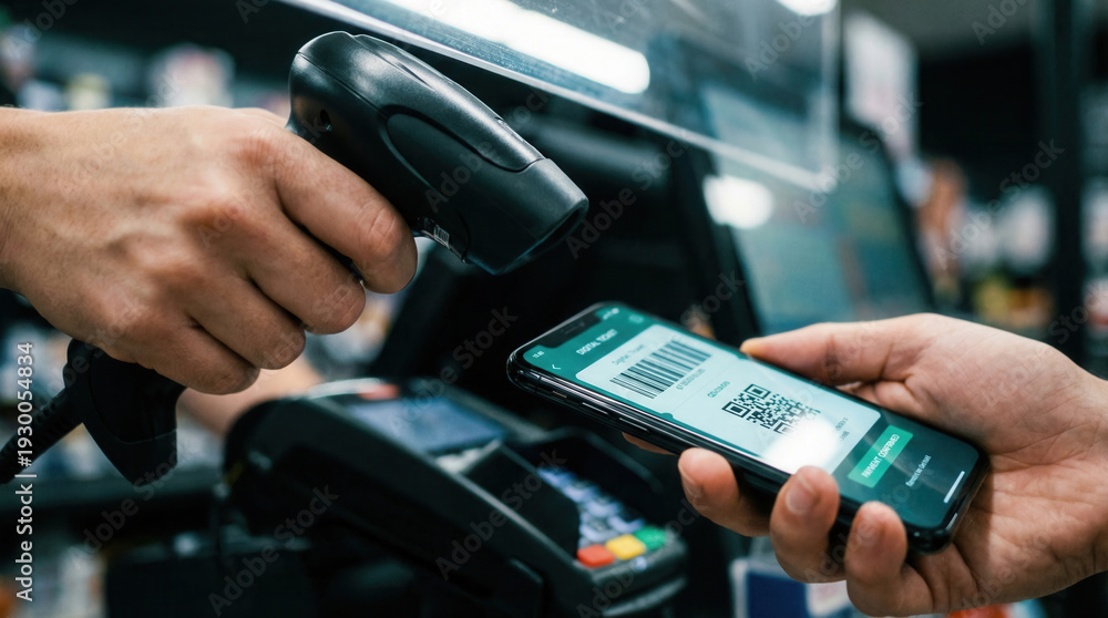Digital wallet mobile payment barcode scan at checkout counter closeup and modern transaction #1930054834