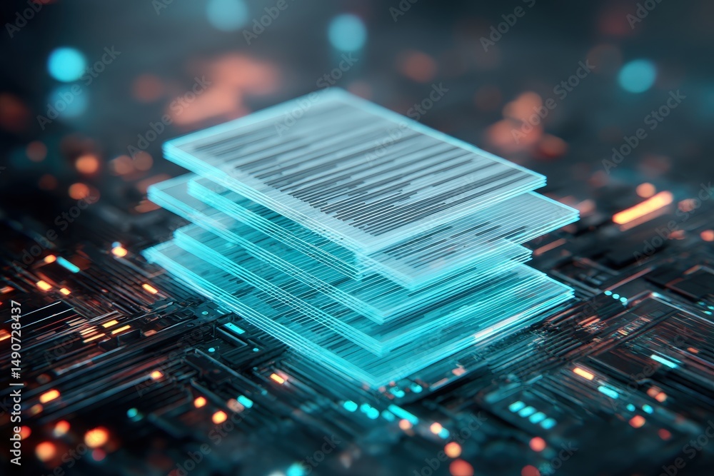digitization process ,A digital stack of documents glows with blue light, symbolizing electronic data storage and futuristic information technology. #1490728437