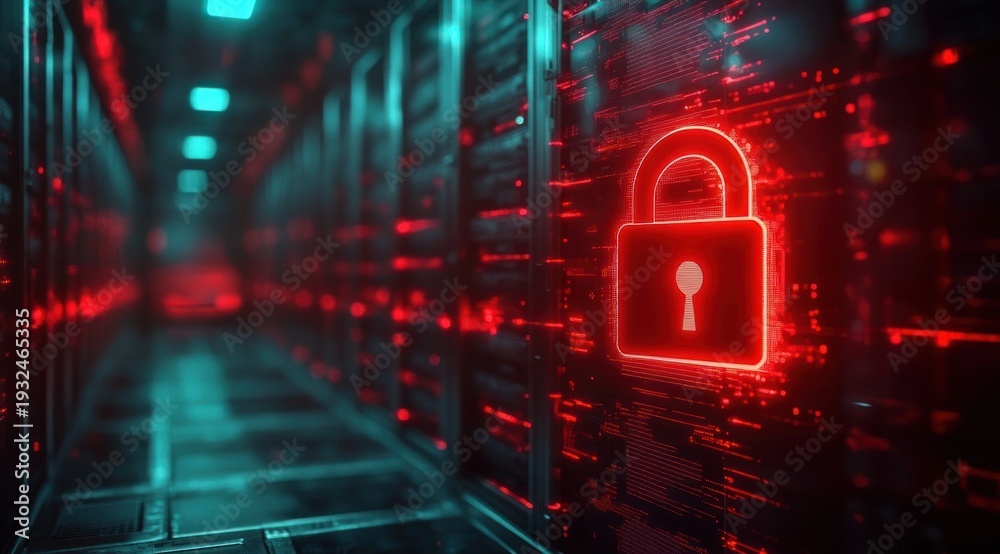 Dim data center corridor lined with server racks and neon teal lights, a large red glowing padlock and streaming code create a tense cyber security alert #1932465335