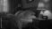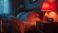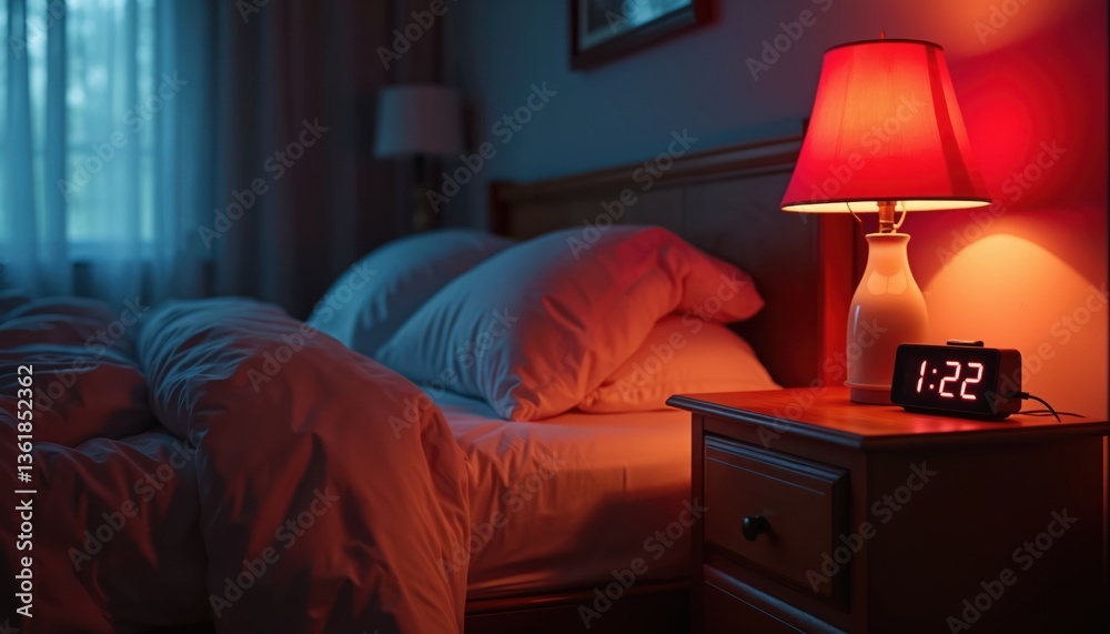 Dimly lit bedroom with unmade bed. Red lamp on nightstand illuminates clock showing 1 22 AM. Home interior design with furniture, alarm clock, light and dark atmosphere. #1361852362