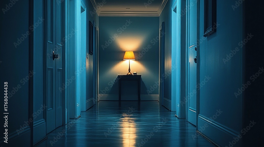 Dimly lit hallway with closed doors on both sides and a small table with a glowing lamp casting warm light on the blue walls and wooden floor #1768044438