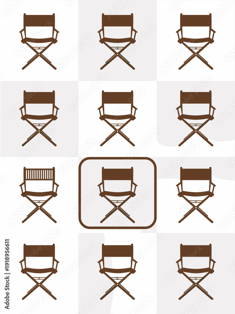 Directors Chair Icon Set Arranged in Graphic Design Grid: Film Industry Concept, Theater, Movie Production, Entertainment Business Theme, Actor, Seat Symbols, Retro Style, Wood, Furniture, Equipment, #1918956611