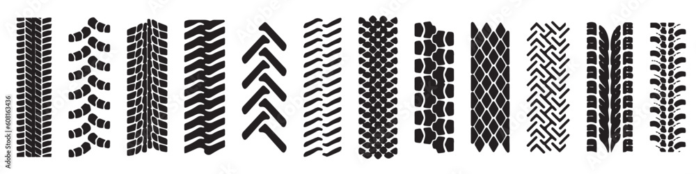 Dirty tire tracks. Grunge motor race track, wheel tires protector pattern and dirt wheels imprint texture vector illustration set.EPS 10 #608163436