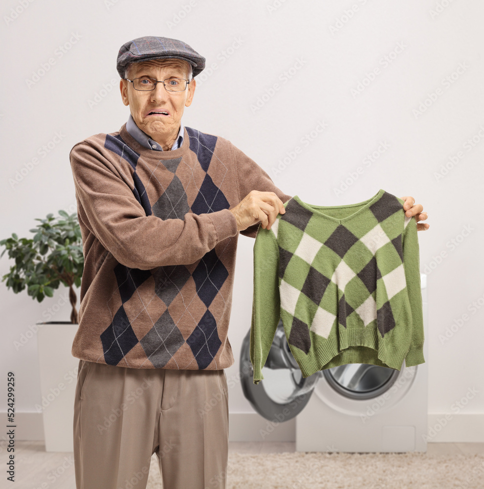 Disappointed senior man holding a shrunken blouse in a bathroom #524299259