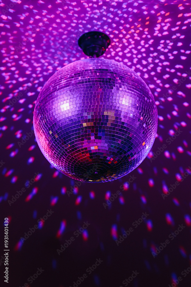 disco ball with mirror surface and bright rays, purple color, hanging on ceiling, night party background #1931401430