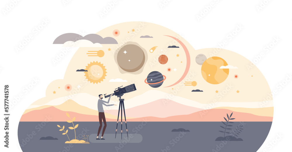 Discovery or universe exploration with star observation tiny person concept, transparent background. Look to planets and space to find new orbits, meteors or asteroids illustration. #577741578