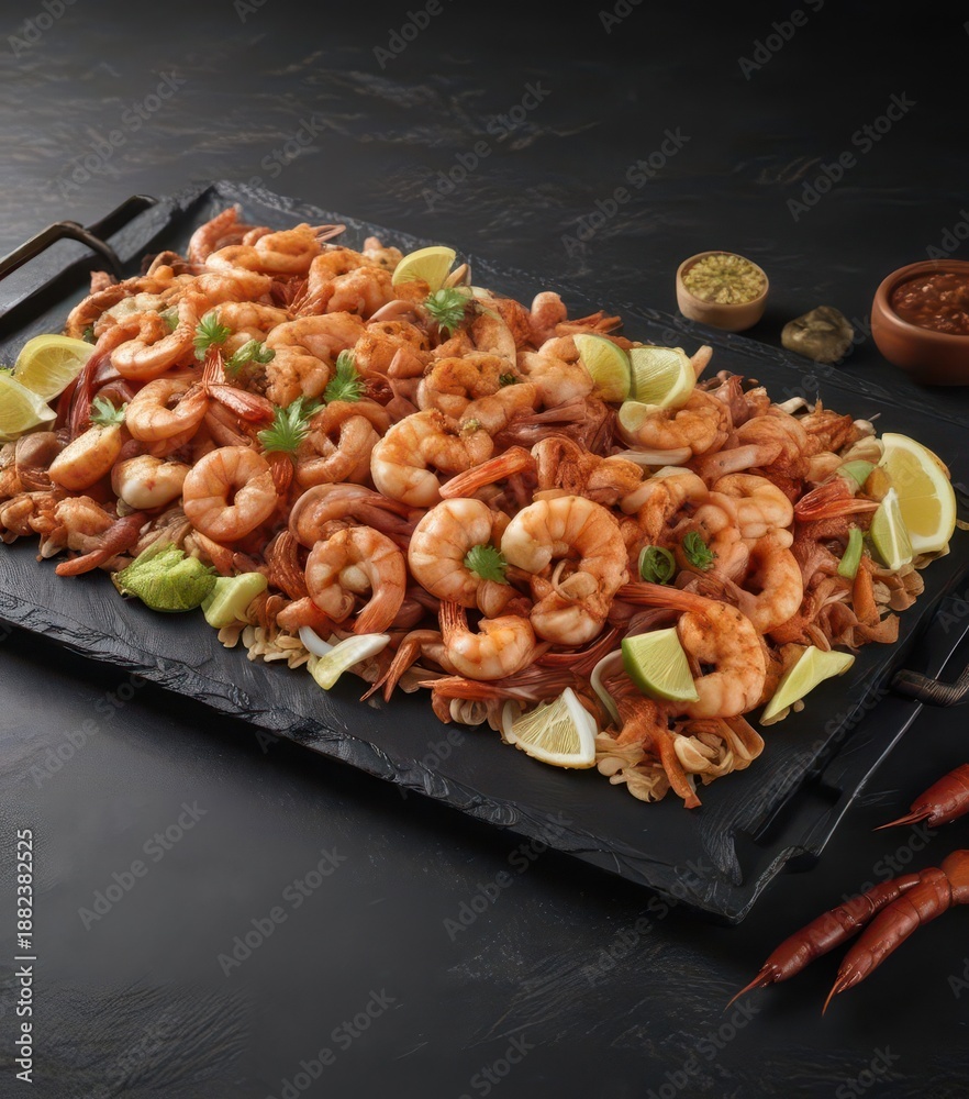 Dish on black slate tray with sizzling shrimp doner, cuisine, appetizer, meat #1882382525