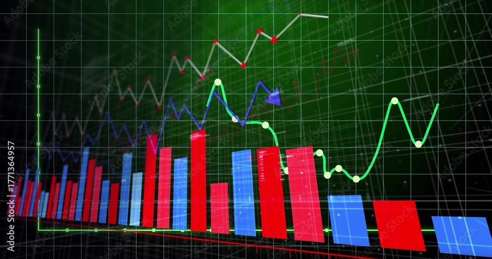 Displaying charting interface, red blue bars, line charts with markers over neon green grid axes #1771364957