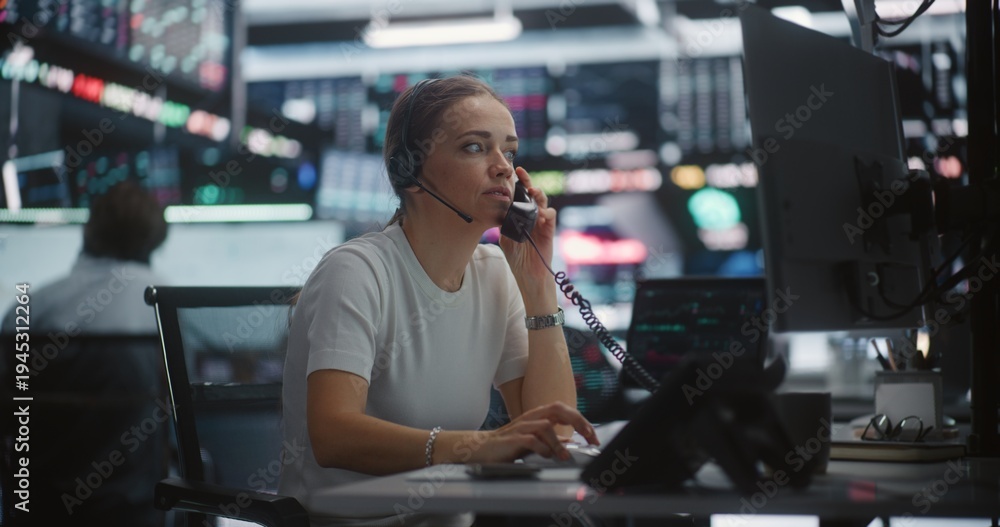 Distressed Female Trader Calling on Desk Phone During Sudden Stock Market Crash. Woman Shock and Despair as Watches Rapid Downward Spiral of Chart on Monitors. Market Collapse, Urgent Intervention. #1945312264