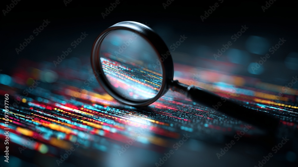 Dive into the details with this striking magnifying glass revealing vibrant data streams, perfect for tech, innovation, and research projects #1697097760