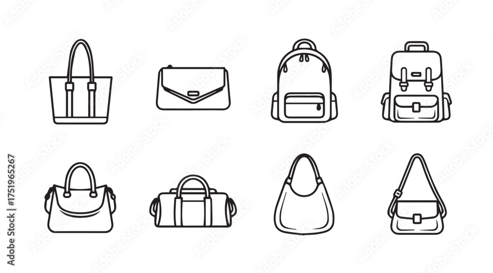 Diverse collection of handbag and backpack icon set for fashion and travel vector #1751965267
