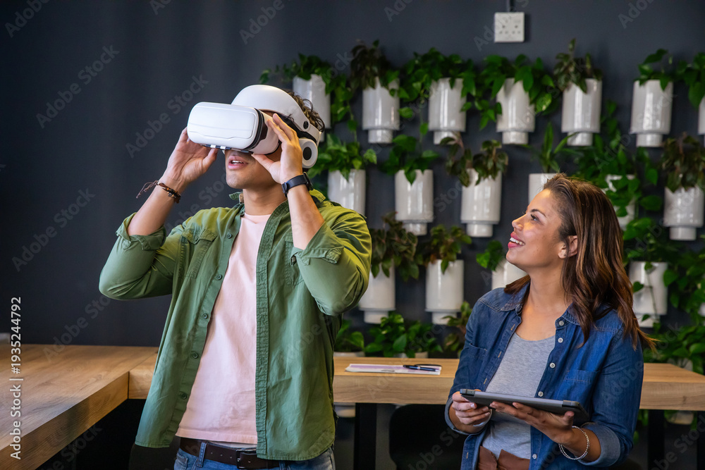 Diverse coworkers adjusting white VR headset and holding tablet at modern office wooden high table #1935244792