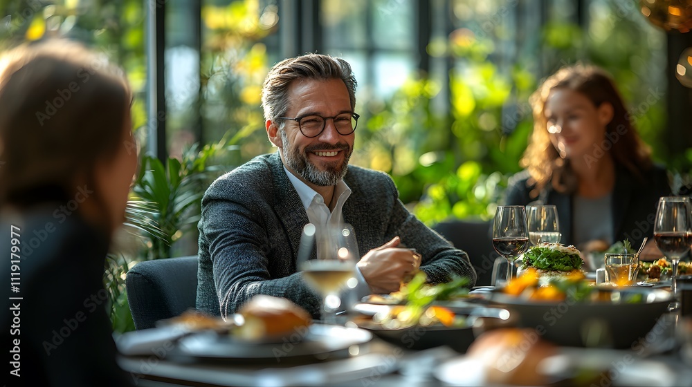 Diverse group of employees enjoying a light lunch in a stylish office lounge, relaxed mood, modern design, wide view #1119179977