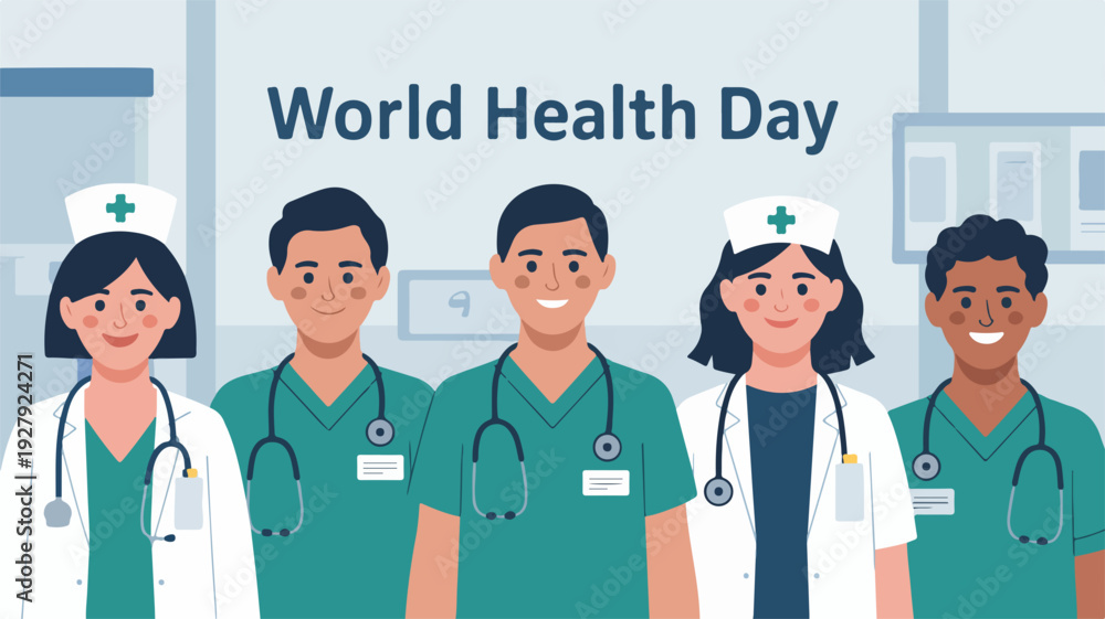 Diverse group of medical professionals celebrating world health day in a hospital setting with a sense of unity and care #1927924271