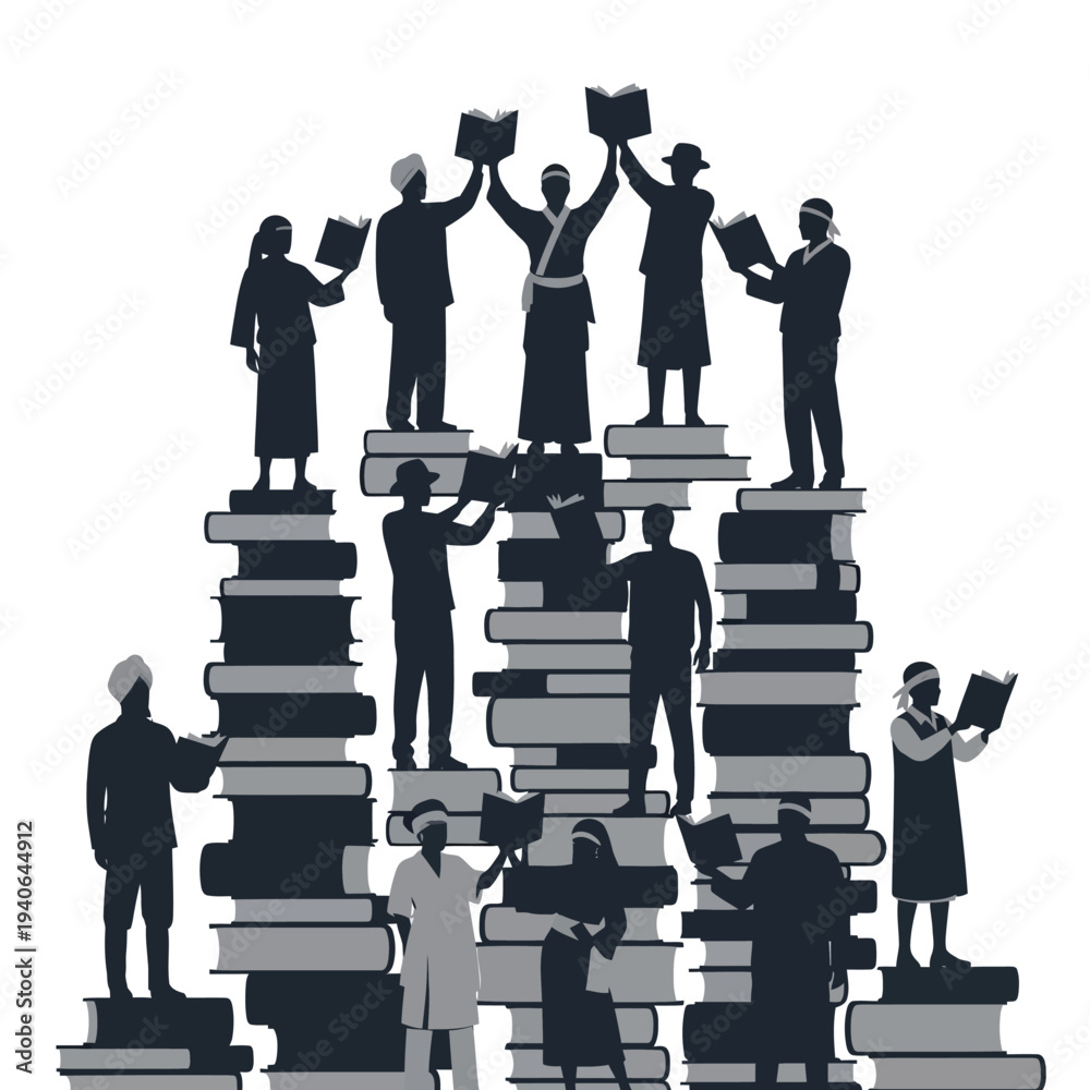 Diverse group of people building towers with books together. #1940644912