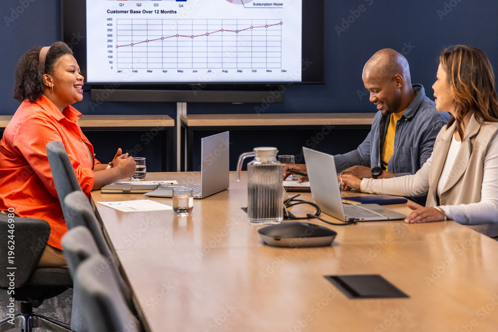 Diverse team meeting around long table in boardroom in business casual with laptops, speaker, chart #1962446980