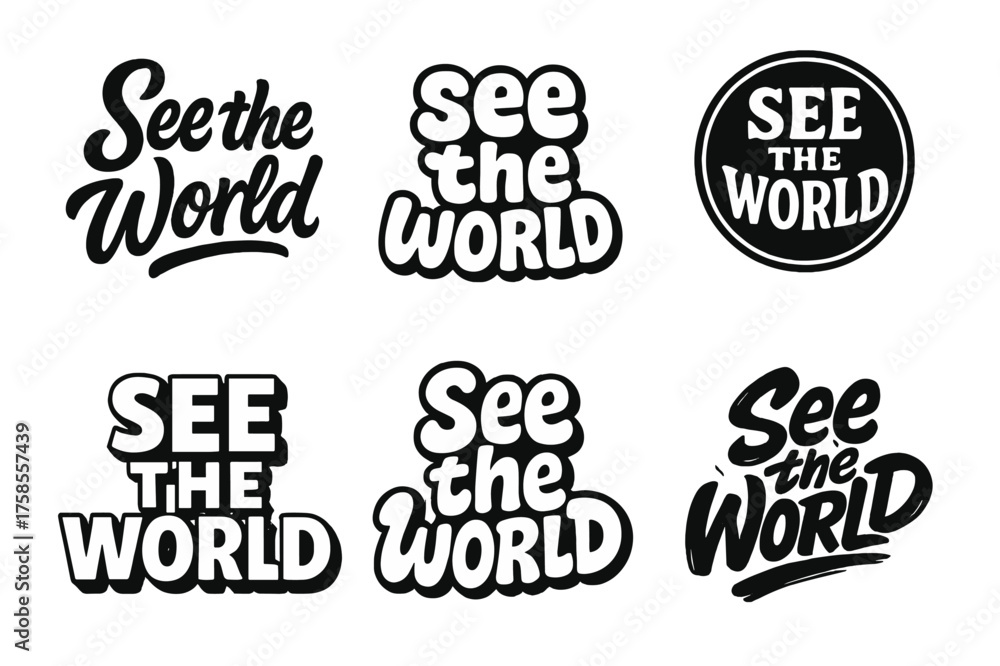 Diverse Typography Grid. See the world. Set lettering. harmonious lettering variations of the same emblematic concept (Bold hand-lettering with playful #1758557439