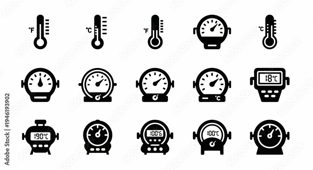 Diverse vector icons thermometers and gauges for temperature, pressure measurement, and monitoring in scientific and industrial applications #1946193902