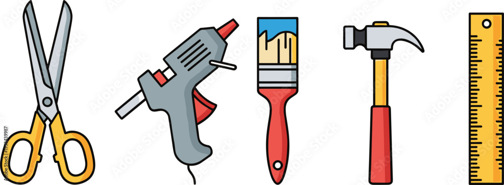 DIY tools and craft equipment icon set including scissors glue gun brush hammer ruler vector illustration colored isolated design collection #1953439987