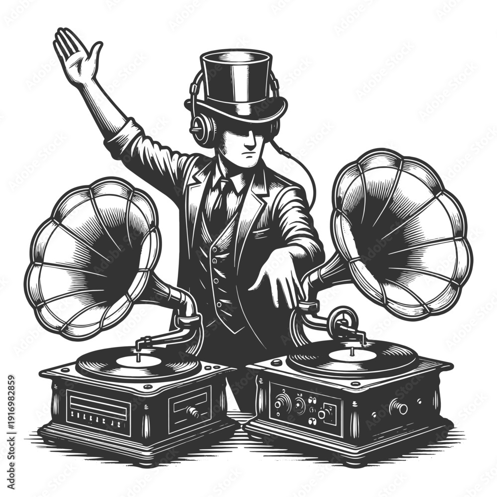 DJ in top hat using dual gramophones like turntables, blending old music style with modern mixing concept sketch engraving generative ai vector illustration. Scratch board imitation. Black and white. #1916982859