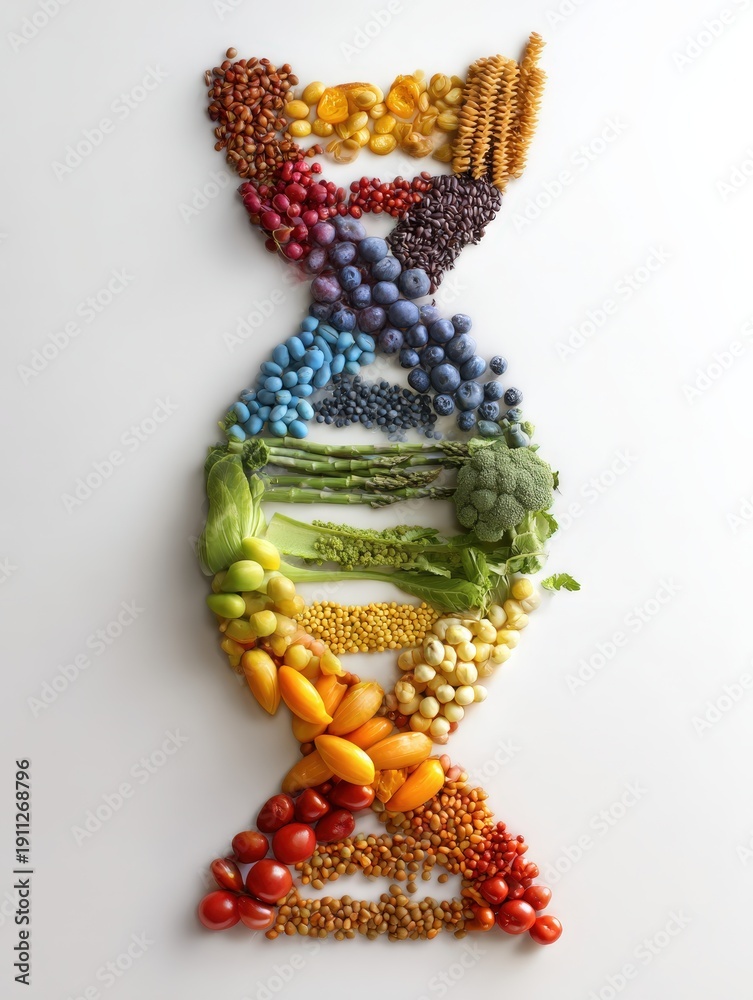 DNA Helix of Fresh Produce: A visually striking representation of a DNA double helix, artfully constructed with an array of fresh, colorful fruits and vegetables. Evoking ideas of nutrition. #1911268796