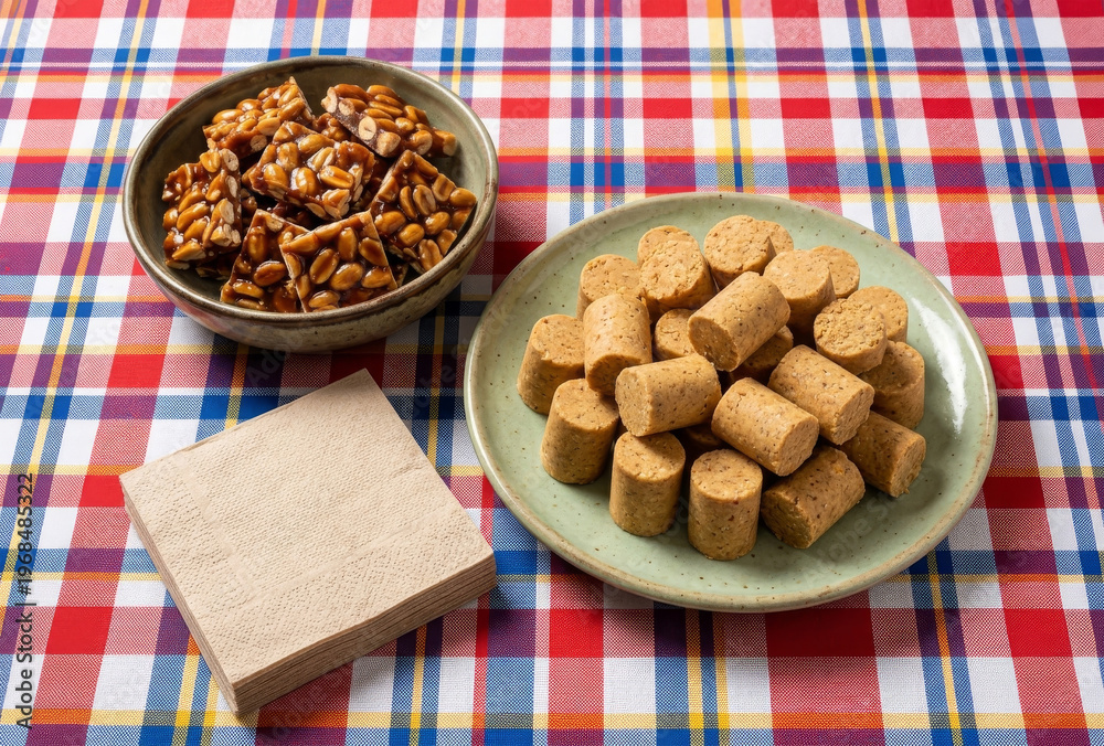 Doces típicos brasileiros de Festa Junina com paçoca e pé de moleque sobre toalha xadrez #1968485322