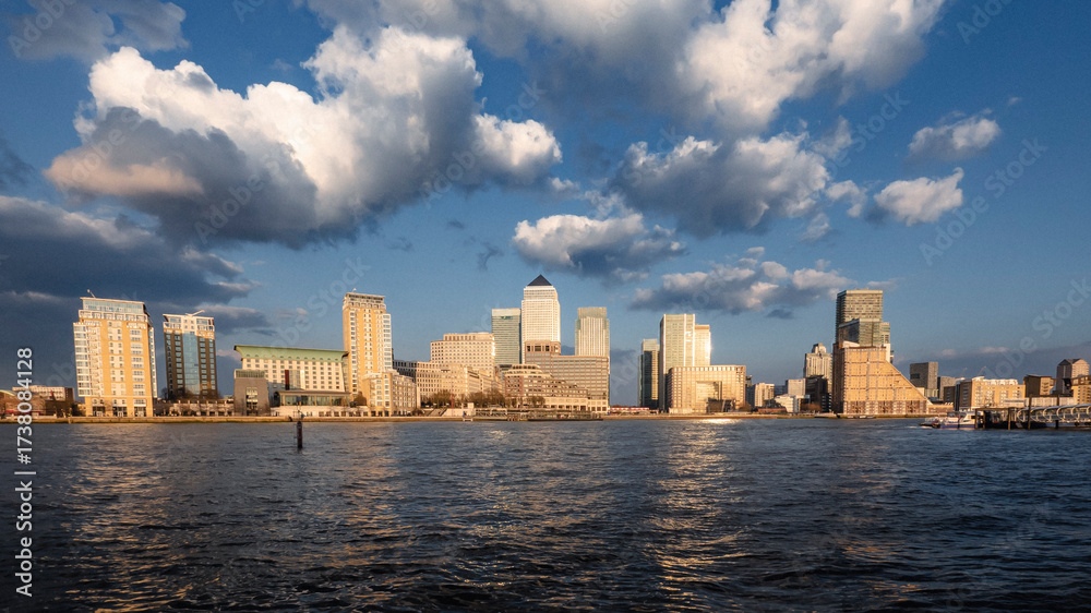 Docklands, London. A striking view of the Canary Wharf skyline at golden hour, with the setting sun illuminating the buildings and casting a warm glow across the water of the River Thames. #1738084128