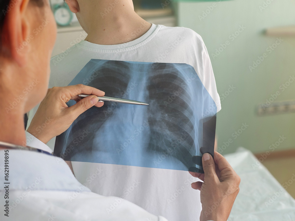 Doctor examining chest X-ray of child in clinic to assess respiratory health concept #1621919895