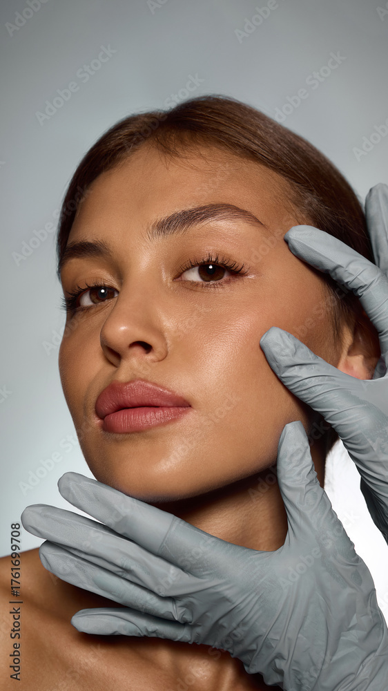 Doctor hands in gloves touching woman face symbolizing care and confidence in skin health. Concept of dermatology, skincare trust, psychological comfort, and professional empathy. #1761699708