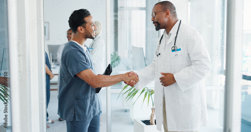Doctor, handshake or nurse on tablet in hospital teamwork collaboration, medical research planning or surgery vision idea. Smile, happy or shaking hands healthcare workers, technology or welcome talk #566595050
