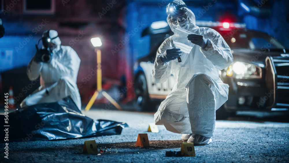 Documentary Shot: Forensics Unit Professionally Gathering Evidence From a Crime Scene and Working as a Team. Paramedics and Policemen are on Site. Expert Insuring Proper Packaging of Weapon #560984445