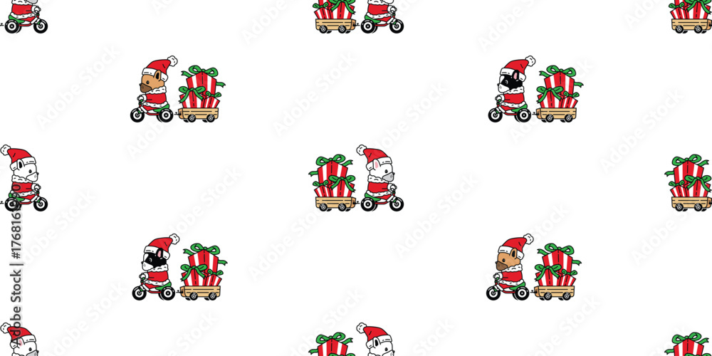 dog pattern seamless french bulldog Christmas Santa Claus hat bicycle riding vector gift box pet cartoon doodle gift wrapping paper tile background repeat wallpaper illustration scarf isolated design #1768161990