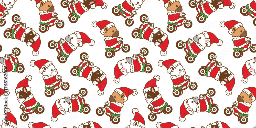dog pattern seamless french bulldog Christmas Santa Claus hat bicycle riding vector pet cartoon doodle gift wrapping paper tile background repeat wallpaper illustration scarf isolated design #1768162006
