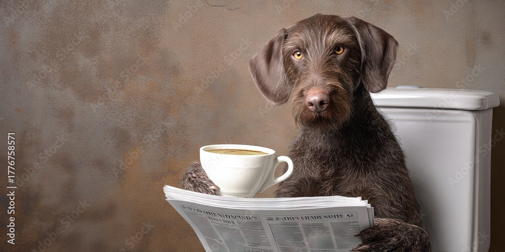 dog sitting on toilet holding cup of coffee and reading newspaper #1776758571