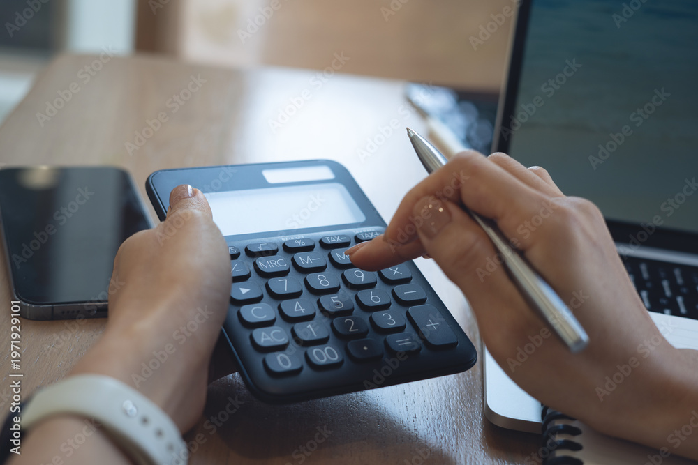Doing finance, budgeting and tax calculation. Close up woman hand using calculator to calculate home finance, accounting with laptop computer on table, budget management, monthly expenses. #1971929101