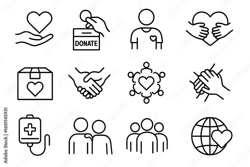 Donation and volunteering line icon set. Charity, community, support, unity, help, love and social care concepts. Thin line vector pictograms for humanitarian aid projects. #1601145931