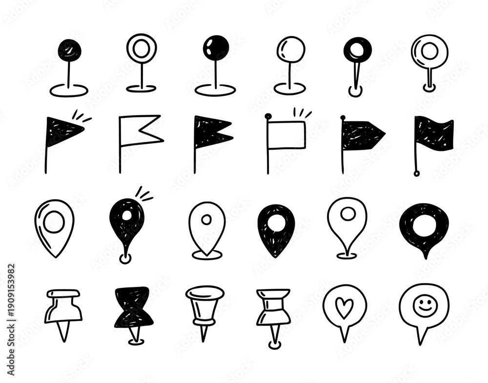 Doodle location pin. Sketch local icons. Hand drawn pencil address coordinate symbols, chalk digital map pinpoint, GPS tag, place marker, journey point. Vector set #1909153982
