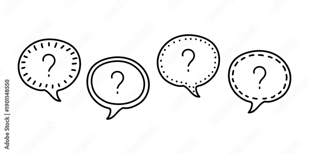 Doodle speech bubble line icons with question marks. Concept of asking frequent questions or communication. Hand drawn text box for FAQ and solution. Vector #1901148550