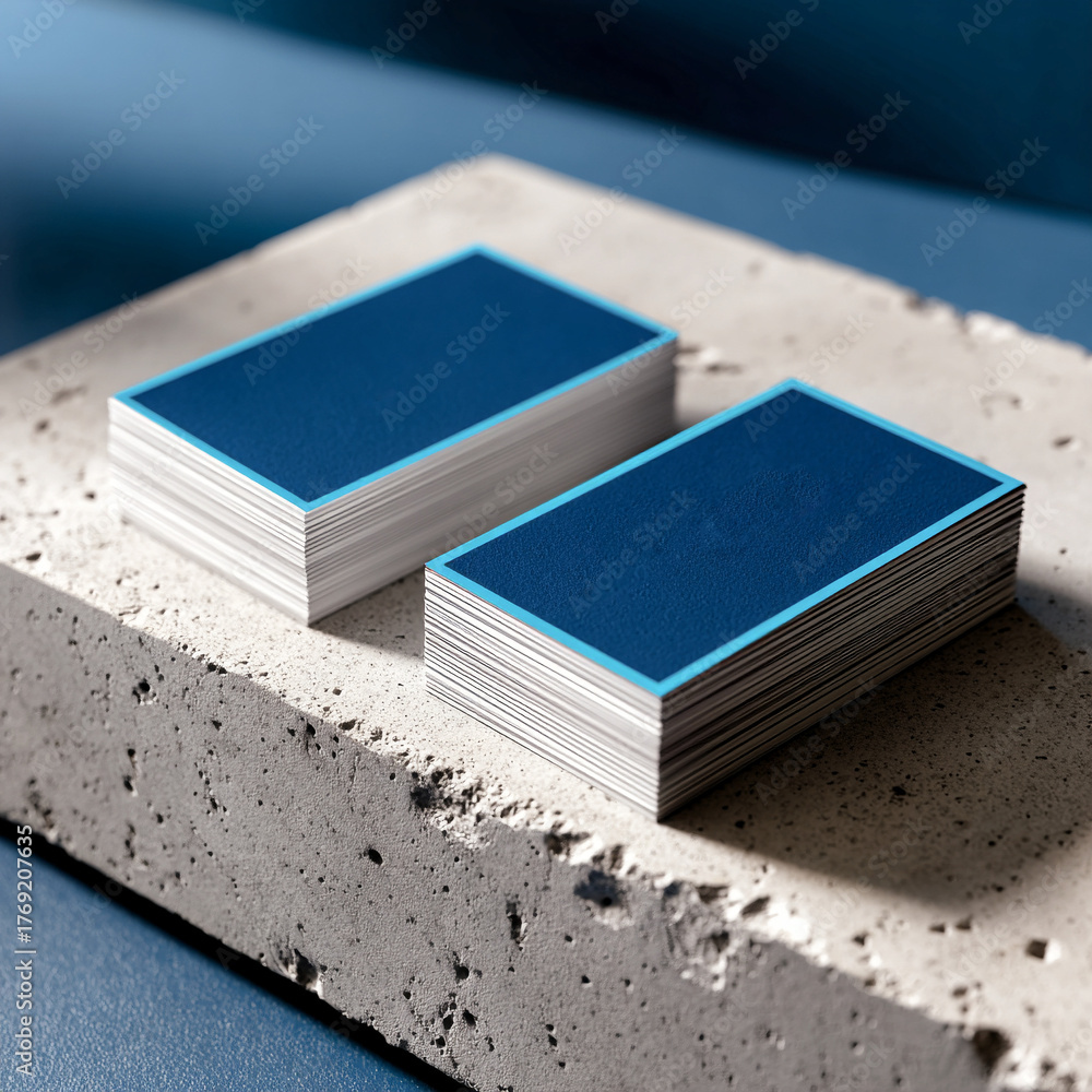 Dos pilas de tarjetas azules sobre superficie de cemento con luz natural y fondo azul minimalista #1769207635