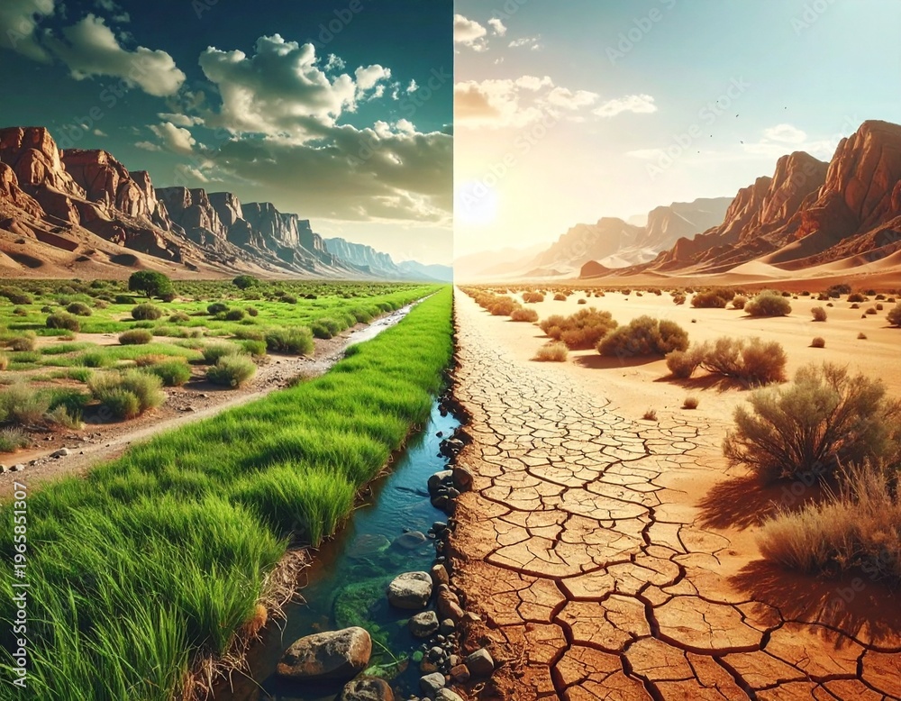 Dos realidades, un mismo planeta. División de escena, mitad seca mitad verde, río vs desierto, mensaje ambiental #1965851307