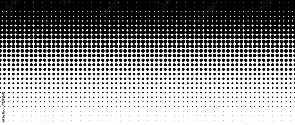 Dotted halftone gradient texture. Vanishing polka dot background. Repeating dots gradation pattern background. Black fading comic pop art overlay backdrop. Raster effect wallpaper. Vector texture #785792453